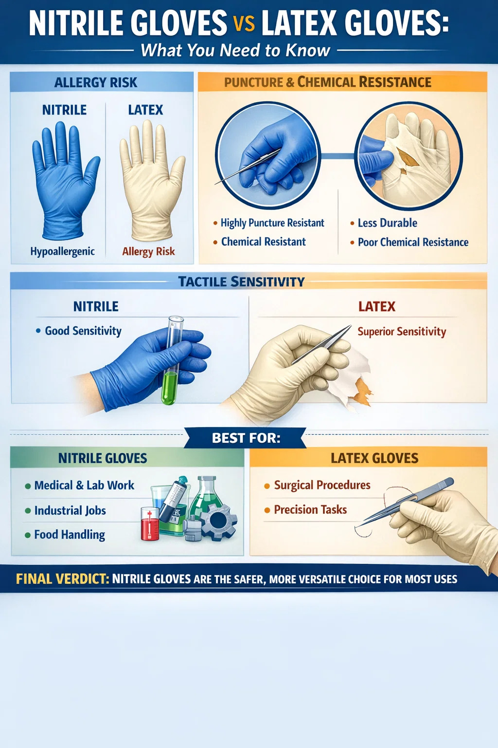 Das heißt, „sicherer“ hängt von Ihrem spezifischen Kontext ab. Latexhandschuhe bieten nach wie vor bedeutende Vorteile hinsichtlich der Tastsensibilität und Elastizität, weshalb sie in bestimmten chirurgischen und heiklen Eingriffen bevorzugt eingesetzt werden. Das Ziel dieses Artikels besteht darin, die Unterschiede klar aufzuschlüsseln, damit Sie eine fundierte Entscheidung auf der Grundlage Ihres tatsächlichen Anwendungsfalls treffen können – und nicht auf einer allgemeingültigen Empfehlung.