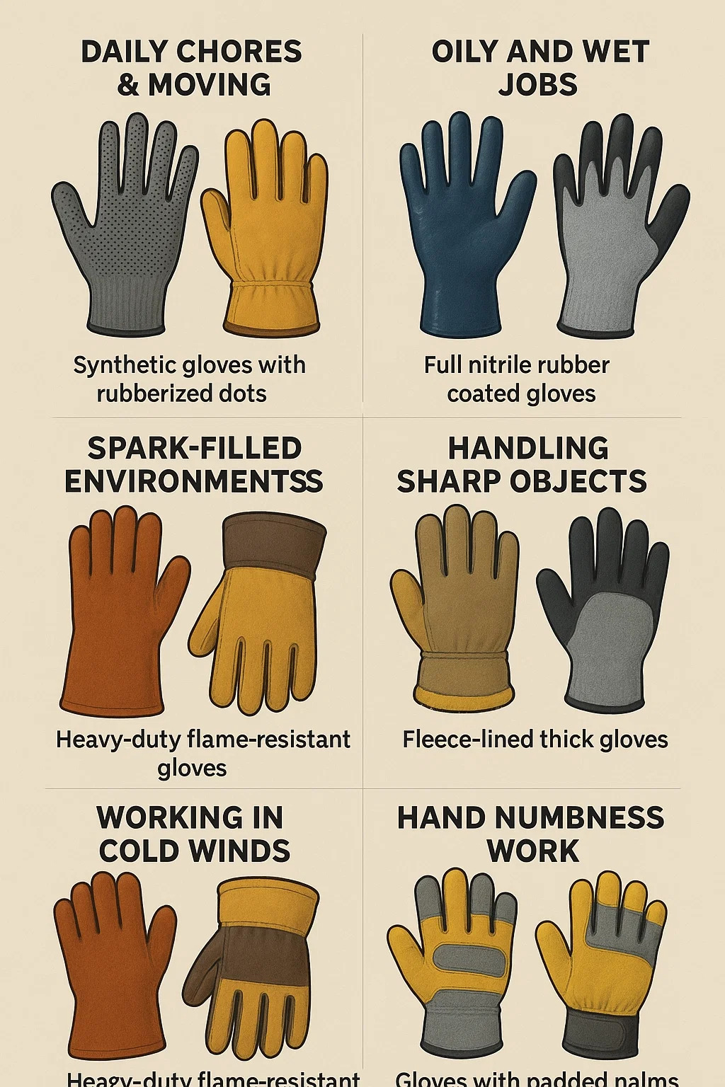 Bei der Auswahl wirklich guter Produkte gibt es keine allgemeingültige Antwort Arbeitshandschuhe – Das beste Paar hängt ganz von der Arbeit ab, die Sie ausführen. Der Schlüssel liegt darin, den am besten geeigneten Schutz und die am besten geeignete Funktion zu finden. Hier sind die bevorzugten Typen für häufige Szenarien: