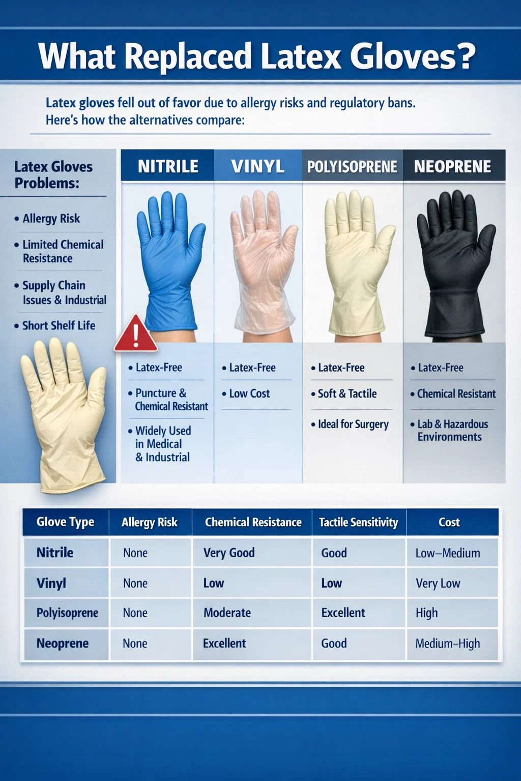 In regulierten Gesundheitsumgebungen in entwickelten Märkten sind Latexhandschuhe jedoch praktisch veraltet. Auf die Frage, was Latexhandschuhe ersetzt hat, gibt es in diesem Zusammenhang eine klare Antwort: Nitril war es, während Polyisopren die Nische der Präzisionschirurgie abdeckte. Auf breiteren Verbraucher- und Industriemärkten ist die Antwort vielfältiger – aber die Richtung geht eindeutig weg von Latex und hin zu synthetischen Alternativen, die das Allergierisiko ohne nennenswerte Leistungseinbußen beseitigen.
